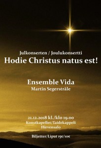 Ensemble Vidas julkonserter kommer i år att äga rum i Kimito kyrka den 18 december kl. 18 och i S:ta Katarina kyrka i Åbo den 20 december kl. 19. Det blir Vidas första utflykt i Åboland och samtidigt återvänder kören till kyrkan där den första julkonserten gavs 2014! På programmet renässans- och barockmusik samt julklassiker, framförda av både mindre ensembler och till instrumentalackompanjemang. Välkomna! Biljetter vid dörren 15/10e.