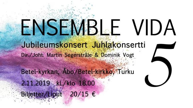 Ensemble Vida fyller fem år och firar med jubileumskonsert i Betel-kyrkan 2.11.2019 kl. 18. På programmet står klassiker från de fem åren samt också ett Finlandsuruppförande och en avdelning med jubileumskören, som består av tidigare och nuvarande sångare. Konserten dirigeras av Martin Segerstråle och Dominik Vogt.